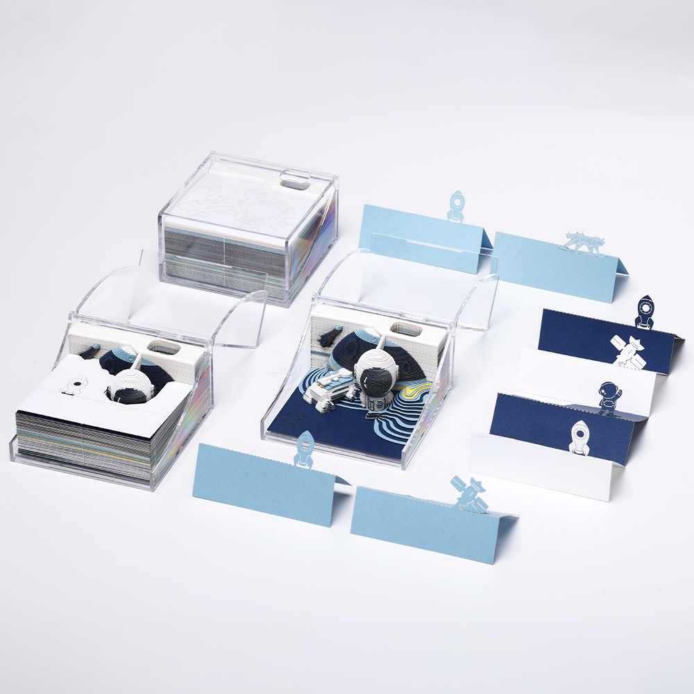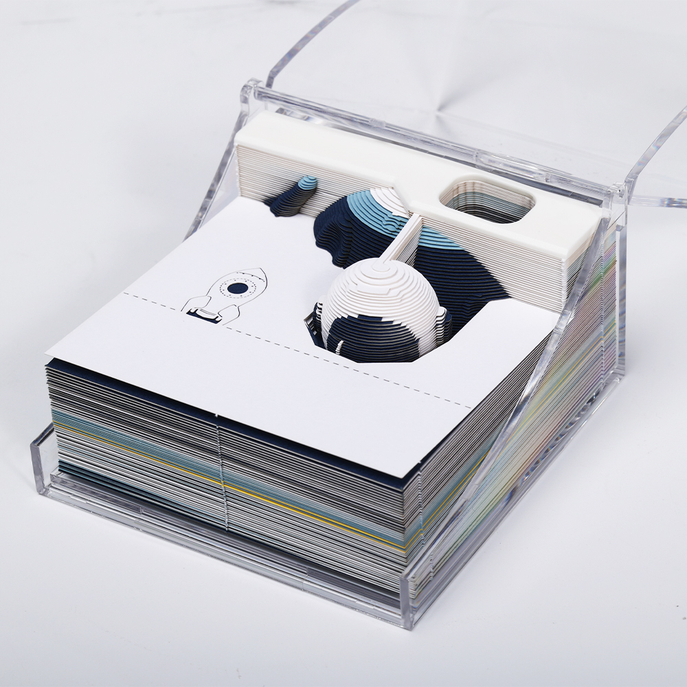 🚀 Como Funciona? Cada folha destacada revela, camada por camada, uma cena cósmica deslumbrante. O que começa como um simples bloco de notas vai, gradualmente, revelando um astronauta e seu traje espacial, entrelaçados com detalhes cósmicos, até que a imagem final se torna uma verdadeira obra de arte 3D. A história do astronauta e sua jornada no espaço toma forma com cada página retirada, dando vida à arte e ao design de forma surpreendente.