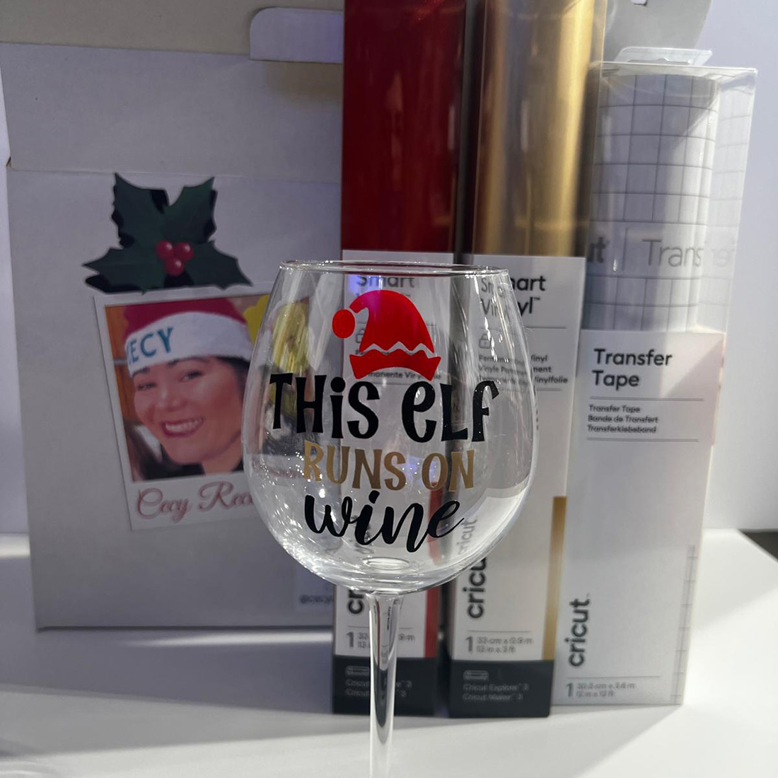 O Kit é composto por: 1 rolo Smart Vinil permanente Cricut preto com glitter; 1 rolo Smart Vinil permenente Cricut Champagne; 1 rolo Smart Vinil permanente Cricut encarnado; 1 rolo Transfer Tape Cricut; Acesso on line ao projeto; Copo de vidro não incluído.