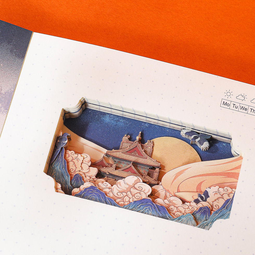Este maravilhoso caderno contem uma paisagem 3D, delicadamente cortada ao longo das suas páginas que, com o caderno fechado, formam uma belissima imagem de um templo nas nuvens. O caderno tem 60 folhas e páginas pontilhadas de 150gsm. A sua capa em cartão rijo é bastante resistente, e a sua lombada em tecido permite que o caderno esteja sempre plano sobre a secretária , facilitado a esscrita. Este caderno é um otimo presente para aquela pessoa na tua vida que adora coisas enovadoras, originais e práticas!