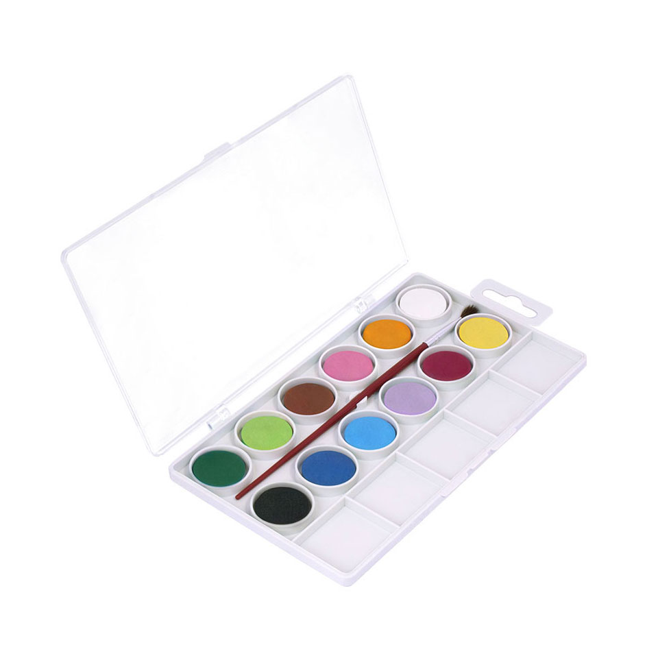 Caixa com 12 aguarelas e pincel com paleta incluída. Tinta adequada para várias superfícies com excelente poder de cobertura. Lavável e sem glúten é adequada para crianças a partir dos 3 anos.