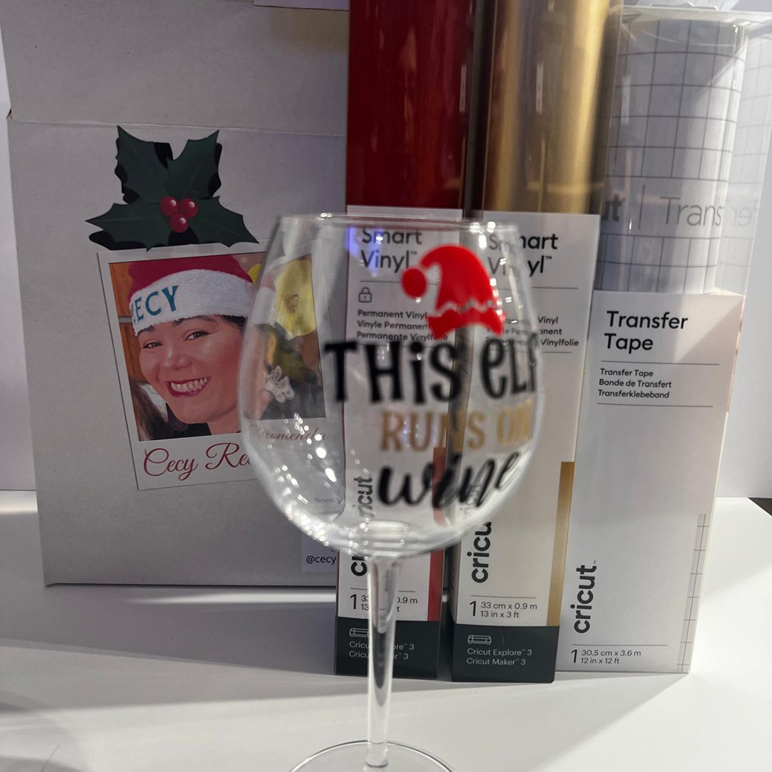 O Kit é composto por: 1 rolo Smart Vinil permanente Cricut preto com glitter; 1 rolo Smart Vinil permenente Cricut Champagne; 1 rolo Smart Vinil permanente Cricut encarnado; 1 rolo Transfer Tape Cricut; Acesso on line ao projeto; Copo de vidro não incluído.